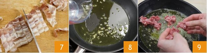 Luego colocad el bacon ahumado sobre una tabla de cortar y cortadlo primero en tiras y luego en cubos 7. Pelad un diente de ajo y picadlo finamente, luego verted aceite de oliva virgen extra en una sartén y, una vez caliente, freíd el ajo picado durante unos minutos, luego desglasad con agua o caldo de verduras 8. Para descubrir cómo prepararlo mejor, consultad nuestra Escuela de cocina: Caldo de verduras. Cuando el líquido se haya evaporado, añadid la salchicha desmenuzada 9.