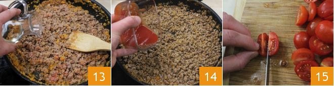 Mezclad para desmenuzar la carne y desglasad con vino blanco seco. Verted una cucharada de concentrado de tomate en un bol pequeño y disolvedlo con un poco de caldo, luego incorporadlo al ragú en cocción 14. Mientras tanto, cortad los tomatitos en cuartos 15.