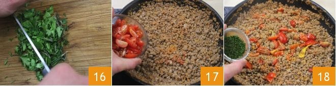 Formad una picada bastante fina de mejorana, tomillo, romero y perejil 16, luego añadid los tomatitos cortados en cuartos y las hierbas aromáticas picadas al ragú (17-18).