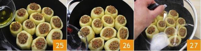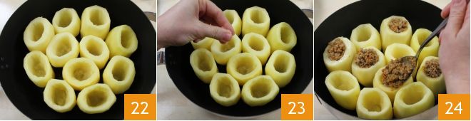 En este punto podéis escurrir las patatas, secadlas con papel absorbente y colocadlas una al lado de la otra en una sartén amplia, adecuada también para la cocción en horno 22. Salpimentad el interior de cada una 23 y rellenadlas con el ragú hasta el borde 24, serán suficientes 2-3 cucharadas por patata.
