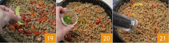 Agregad la cáscara de medio limón 19 y el chile verde picado y sin semillas 20. Salpimentad al gusto 21 y dejad cocinar el ragú durante al menos 30 minutos. Cuando se haya secado, eliminad las cáscaras de limón y ajustad de sal y pimienta si es necesario.