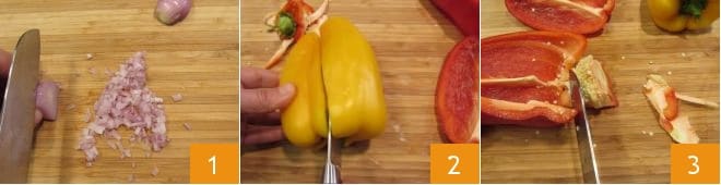 Para preparar la pechuga de pollo con pimientos, empieza limpiando la chalota, luego pícala finamente 1. Lava los pimientos rojos y amarillos, divídelos por la mitad 2 y luego elimina el tallo 3 y las semillas internas.