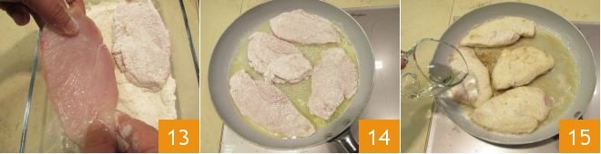 enharina las rodajas de pechuga de pollo 13, una vez que la mantequilla comience a chisporrotear, coloca las rodajas para dorarlas 14 por ambos lados durante unos minutos a fuego medio, luego desglasa con el vino blanco 15 y deja evaporar,