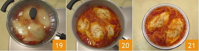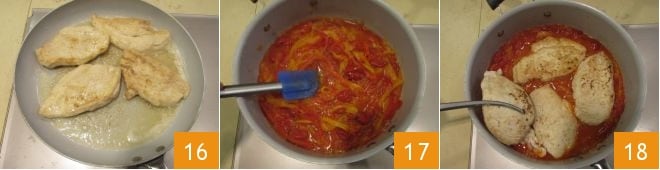 cocina unos pocos minutos, justo el tiempo para dorar la carne 16. Cuando la salsa de pimientos y tomatitos esté lista 17, añade las pechugas de pollo doradas 18.