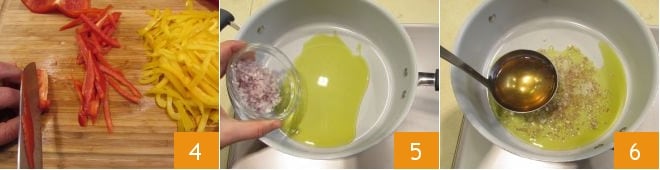 Corta los pimientos en tiras 4 y resérvalos. En una cazuela amplia calienta el aceite de oliva, luego añade la chalota picada 5, sofríe durante 1 minuto y luego moja con un cucharón de agua caliente (o caldo vegetal) 6 y deja estofar durante otros 3 minutos a fuego lento.