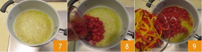 Una vez que la chalota esté blanda 7, añade los tomatitos cherry pelados 8, los pimientos en tiras 9,