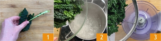 Para preparar el pesto de col rizada, primero limpia la col separando las hojas del tallo central 1. Lleva a ebullición una olla de agua y escalda las hojas durante 3-5 minutos 2. Transfiere la col rizada escaldada a un procesador de alimentos 3.