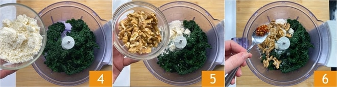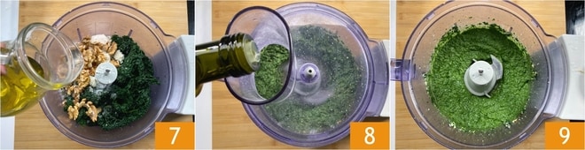 Añade 40 g de aceite 7 y comienza a triturar. Mientras el procesador está en funcionamiento, vierte los restantes 30 g de aceite en un hilo 8. Cuando hayas obtenido una consistencia cremosa y homogénea, tu pesto de col rizada estará listo 9.