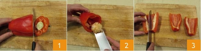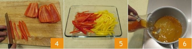 Para preparar los pimientos agridulces comienza por la sanitización de los tarros y tapas, haciendo referencia a las guías del Ministerio de Salud cuyo enlace también encuentras al final de la receta. Mientras los tarros hierven, lava y seca los pimientos, elimina el tallo 1, quita las semillas y los filamentos internos 2, luego divídelos en 4 partes 3