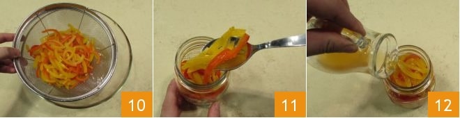 escúrrelos recogiendo el líquido de cocción en un tazón 10; déjalos escurrir hasta que se enfríen completamente, tardará al menos un par de horas. Ahora envasa los pimientos sin llegar hasta el borde (deja 2 cm desde el borde) 11, cúbrelos completamente con el líquido de cocción, ya frío 12, el líquido debe superar al menos 1 cm el nivel de las verduras.