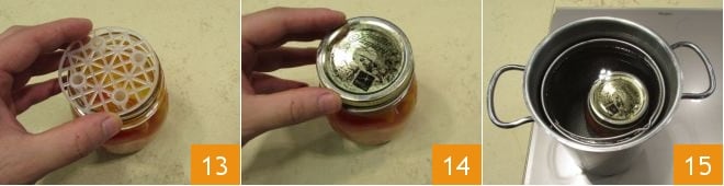 Para evitar que los alimentos floten sobre el líquido, se recomienda el uso de distanciadores de plástico para insertar dentro del tarro 13. Cierra bien los tarros apretando cuidadosamente las tapas 14 y procede con la pasteurización, es decir, la ebullición de los tarros, respetando siempre las guías del Ministerio de Salud que encuentras al final de la ficha 15. Siempre verifica que se haya creado el vacío: al presionar en el centro de la tapa, no debes escuchar el "click-clack".