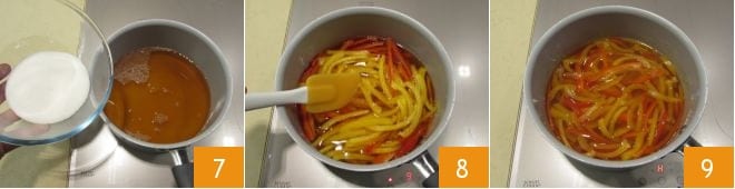 el azúcar 7, la sal y cocina todo a fuego lento, removiendo de vez en cuando. Cuando el azúcar y la sal se hayan disuelto, añade los pimientos 8 y cubre con una tapa. Los pimientos deben cocinarse pero no deshacerse: tardarán unos 20 minutos, pero revisa después de unos quince minutos porque el tiempo puede variar según la carnosidad de los pimientos. Una vez listos 9