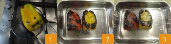Para preparar los pimientos rellenos a la napolitana, comienza asando los pimientos sobre la llama del fogón con una rejilla especial dispersadora de llama durante al menos 10 minutos cada uno, girándolos de vez en cuando 1. Si no dispones de la rejilla dispersadora, puedes asar los pimientos en una sartén muy caliente. Coloca los pimientos en una bandeja para horno 2, cúbrelos con film transparente 3 y déjalos así antes de quitarles la piel, durante al menos 15 minutos.