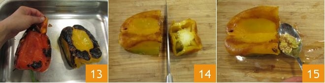 Mientras tanto, recupera tus pimientos y elimina la piel exterior que de esta manera se quitará fácilmente 13. Corta la parte superior 14 y extrae las semillas internas 15.