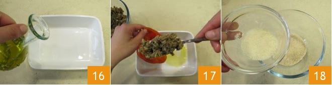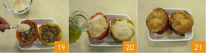 Ahora unta una bandeja para horno con aceite 16, coloca los pimientos y rellénalos con el relleno que has preparado anteriormente 17. En un bol mezcla el parmesano rallado con el pan rallado 18
