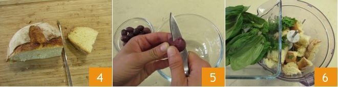Mientras tanto, prepárate para el relleno: corta el pan en rebanadas 4, córtalo en cubos y deshuesa las aceitunas de Gaeta con la herramienta especial o un cuchillo 5. En el vaso de la batidora coloca el pan, las hojas de albahaca y el perejil 6,
