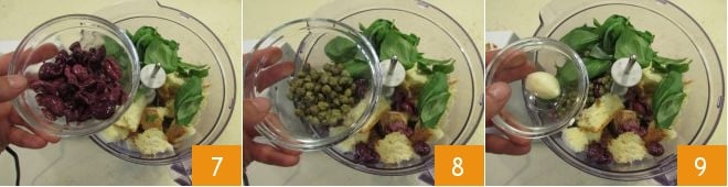 las aceitunas de Gaeta 7 y las alcaparras cuidadosamente desaladas 8. Añade el diente de ajo pelado entero 9