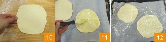 luego estírala con un rodillo hasta obtener láminas de aproximadamente 20 cm de diámetro, con un grosor de unos 2 mm 10. Coloca las láminas obtenidas en una bandeja forrada con papel de horno, úntalas con una emulsión de aceite y agua 11, cubre con film transparente 12 y déjalas levar durante al menos 40 minutos, todavía en el horno apagado con la luz encendida. Para más información sobre la preparación de la Pita, puedes consultar la receta en nuestro sitio web.