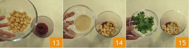 Mientras tanto, puedes encargarte de la preparación del hummus de tomates secos: coloca los tomates secos en un recipiente alto y estrecho, añade los garbanzos 13, la tahina 14, el cilantro previamente lavado y secado 15,