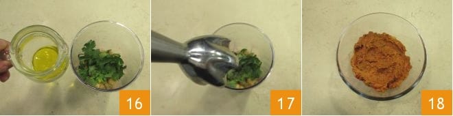 el aceite 16 y la pimienta, luego tritura con una batidora de mano 17 hasta obtener una crema homogénea. Ajusta el hummus de sal, después transfiérelo a un bol pequeño 18, cubre con film transparente en contacto y consérvalo en el frigorífico hasta el momento de usarlo.