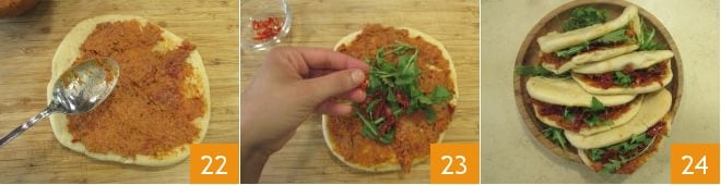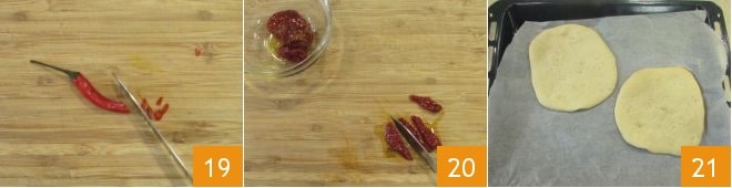 Pasado el tiempo de levado de las pitas, rocíalas con un poco de agua y hornéalas en horno estático precalentado a 250° durante 8 minutos en la bandeja del medio. Mientras tanto, lava y corta finamente la guindilla 19 y corta los otros tomates secos en tiras 20. Cuando las pitas estén cocidas 21, puedes rellenarlas con los ingredientes que preparaste:
