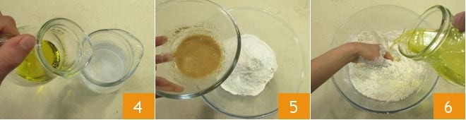 y el aceite 4 y mezcla bien. Ahora tamiza las harinas en un bol grande, añade el agua con la levadura 5 y comienza a amasar con las yemas de los dedos. Luego, sin dejar de amasar, vierte poco a poco el agua con el aceite y la sal 6 y sigue trabajando hasta obtener una mezcla bien amalgamada.