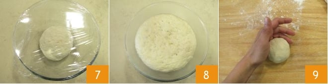 En este punto, transfiere la masa a una superficie de trabajo y dale forma de bola, que debe tener una consistencia lisa y elástica. Coloca la masa formada en un bol aceitado, cubre con film transparente 7 y deja que leve en el horno apagado con la luz encendida durante unas 2 horas o hasta que haya duplicado su volumen. Pasado el tiempo de levado 8, transfiere la masa a una superficie de trabajo ligeramente enharinada y divídela en 4 porciones de aproximadamente 100 g cada una. Da forma de bolita a cada porción de masa 9,