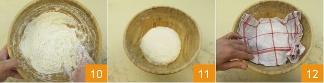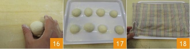 Con la ayuda de un poco de harina, dé a cada porción unos pliegues para formar una bolita, poniendo los bordes por debajo 16 y colóquelas en una bandeja ligeramente enharinada (la parte de los bordes recogidos y llevados al centro con los pliegues quedará en contacto con la base) 17. Cubra con un paño seco esta vez 18 y deje reposar durante al menos otras 2 horas, siempre en un lugar lejos de corrientes de aire.