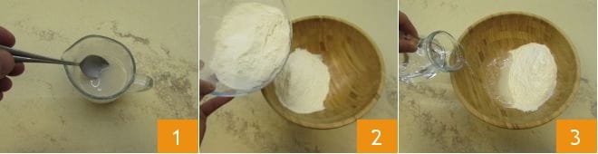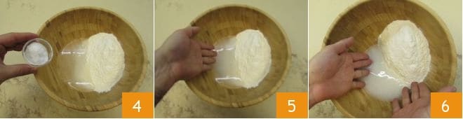Luego agregue la sal al agua 4 y disuélvala mezclando suavemente con las manos 5. Tan pronto como ya no sienta ningún grano, comience a mezclar también la harina 6.