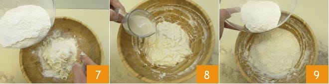 Vierta un poco más de harina 7 y poco a poco con las manos, haciendo un movimiento rotatorio, mezcle con el agua. Cuando haya incorporado aproximadamente el 50% de la dosis de harina, agregue a la masa la levadura disuelta previamente 8. Continúe agregando un poco más de harina 9