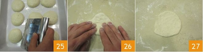 Pasadas las 2 horas de fermentación de las bolitas, ponga al fuego una sartén grande con aceite de semilla de cacahuete para llevar a una temperatura máxima de 180 °C (verifique con un termómetro de cocina). Utilizando una rasqueta, ayúdese a despegar una porción a la vez de la bandeja 25 y transfiérala a la superficie de trabajo ligeramente enharinada. Utilizando las yemas de los dedos, extienda su primera pizzella, ampliándola suavemente (26-27).