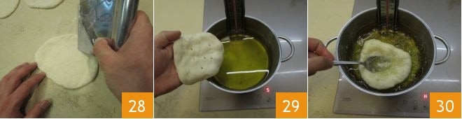 Luego, utilizando la punta de la rasqueta, haga pequeños agujeros en la masa 28; de esta manera, durante la cocción no se inflará demasiado. Tan pronto como el aceite haya alcanzado la temperatura indicada, sumerja la pizzella 29, presionando en el centro con una cuchara 30, para evitar que se infle excesivamente y para crear una cavidad central que, una vez cocida la pizzella, permita contener el condimento.