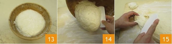 Deje reposar durante al menos 4 horas a temperatura ambiente, lejos de corrientes de aire. Pasado este tiempo, recupere la masa 13 y transfiérala, utilizando una rasqueta, a una superficie ligeramente enharinada 14. Siempre utilizando la rasqueta, divídala en porciones de 50 g cada una 15. Con estas dosis obtendrá aproximadamente 25 porciones.
