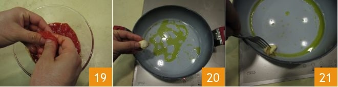 Mientras tanto, ocupe del tomate; transfiera los tomates San Marzano a un bol de vidrio y desmenuce con las manos 19; alternativamente, puede usar un tenedor. Luego vierta un hilo de aceite en una sartén, agregue un diente de ajo entero previamente aplastado 20 y déjelo freír hasta que esté dorado; luego retírelo 21.