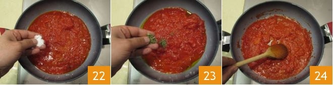 Agregue entonces el tomate a la sartén y ajuste de sal 22; luego también añada el orégano 23 y déjelo cocinar a fuego lento durante al menos media hora, removiéndolo con frecuencia, hasta que se haya reducido 24.