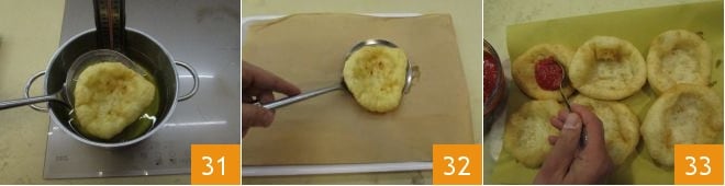 Cuando esté bien dorada, escurra la pizzella con una espumadera 31 y colóquela sobre una hoja de papel para frituras 32. Continúe cocinando de la misma manera las otras. Tan pronto como estén cocidas, podrá condimentarlas: vierta una cucharada de salsa de tomate en la cavidad de cada pizzella 33