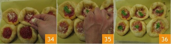 luego un poco de queso rallado 34. Termine con hojas de albahaca fresca 35 ¡y sirva sus pizzelle todavía calientes 36!