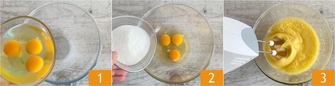 Para preparar el plumcake de naranja lo primero que tenéis que hacer es exprimir las naranjas después de rallar la cáscara: necesitaréis 50 g de zumo y aproximadamente 5 g de cáscara. Colocad en un bol los huevos enteros 1 y el azúcar 2 y empezad a batir con las varillas eléctricas hasta obtener una mezcla esponjosa y espumosa 3.