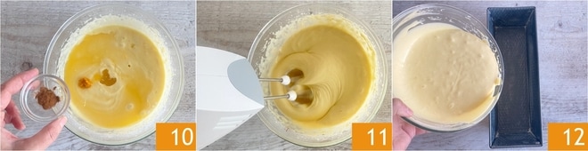 Por último, perfumad con una pizca de canela en polvo 10 y trabajad nuevamente todo para que la mezcla quede suave y homogénea 11. Verted la masa obtenida en un molde de plumcake de 30x11 cm que habréis engrasado previamente 12.