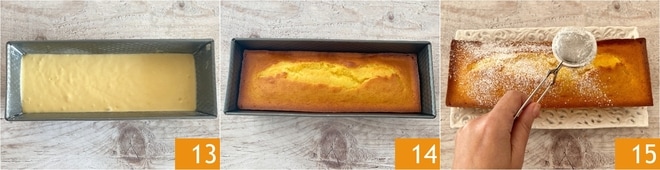 Coced en horno estático precalentado a 180° durante unos 40 minutos 13. Siempre verificad la cocción con un palillo antes de sacar del horno. Una vez cocido, sacad del horno y dejad enfriar completamente en el molde antes de desmoldar 14. Espolvoread con azúcar glas a gusto y disfrutad de vuestro plumcake de naranja 15!