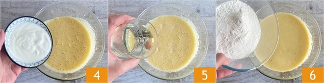 Verted el yogur 4 y el aceite de semillas 5, luego trabajad nuevamente con las varillas a velocidad más alta. Añadid la harina tamizada 6.