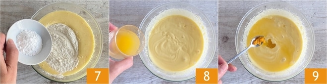 Añadid también la levadura tamizada 7 e incorporad los polvos siempre con las varillas, luego agregad el zumo de las naranjas exprimidas 8 y la cáscara rallada 9.