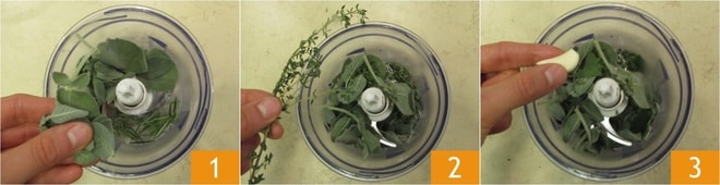 Para preparar el pollo con hierbas y setas, primero prepara la mantequilla aromatizada: coloca en una batidora el romero, la salvia 1, el laurel, el tomillo 2 y el diente de ajo 3.