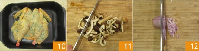 Coloca el pollo en una bandeja con la parte abierta hacia abajo 10 y hornea en horno estático precalentado a 220 grados durante 15-20 minutos, luego baja a 190 grados y continúa cocinando durante otros 15-20 minutos o hasta que la temperatura interna del muslo alcance los 72 grados. Mientras tanto, pica en trozos grandes la mayoría de las setas 11 y reserva algunas de las más bonitas para la guarnición 11. Limpia y pica finamente las chalotas 12.