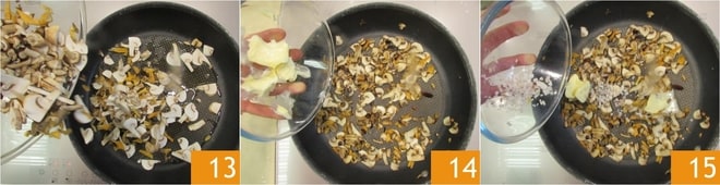 Coloca las setas en una sartén con un chorrito de aceite caliente 13 y saltéalas a fuego alto durante 5-8 minutos. Añade la mantequilla 14 y las chalotas picadas 15 y sofríe.