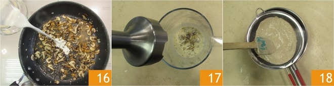 Por último, rocía con el brandy y desglasa con la nata y un chorrito de agua 16. Cocina otros diez minutos, hasta que las setas se hayan ablandado. En este punto, transfiere las setas a un recipiente y tritura con una batidora de inmersión, ajustando de sal 17. Finalmente, pasa la mezcla por un colador para obtener una salsa suave y homogénea 18.