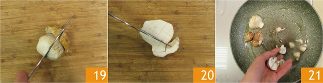Reserva la salsa y retoma las setas que habías reservado: si son pequeñas, déjalas enteras; si son boletus, divídelas por la mitad 19 e incide en forma de cuadrícula el lado cortado del tallo 20. Coloca las setas en una sartén con un chorrito de aceite caliente 21.