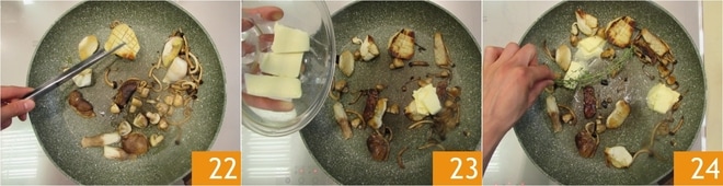Dora las setas por ambos lados a fuego alto 22, luego añade la mantequilla 23, sala y sazona con ajo y tomillo 24. Cocina a fuego alto durante un total de 12-13 minutos, bañándolas con su jugo de cocción.