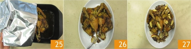 Mientras tanto, el pollo estará cocido, así que retira del horno y deja reposar durante 10-15 minutos cubierto con una hoja de aluminio 25. Pasado este tiempo, emplata y decora con las setas doradas 26, escamas de sal y tomillo. ¡Tu pollo con hierbas y setas está listo para ser servido 27!