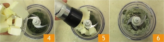 Tritura todo, luego añade la mantequilla 4 y la sal 5. Tritura de nuevo hasta obtener una consistencia cremosa 6.